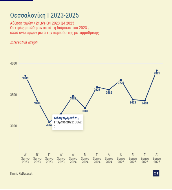 Η πιο εντυπωσιακή μεταβολή καταγράφηκε στη Θεσσαλονίκη. Η αγορά εμφάνισε πτώση τιμών το 2023, ωστόσο ακολούθησε ισχυρή ανάκαμψη τα επόμενα δύο χρόνια.