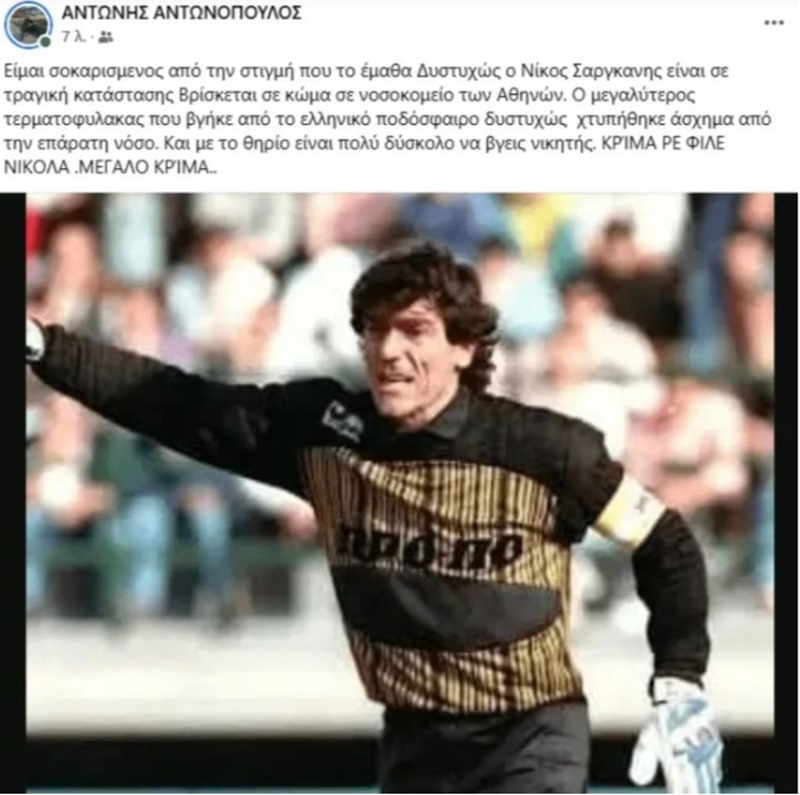 Ο μεγαλύτερος τερματοφύλακας που βγήκε από το ελληνικό ποδόσφαιρο δυστυχώς χτυπήθηκε άσχημα από την επάρατη νόσο. Και με το θηρίο είναι πολύ δύσκολο να βγεις νικητής. ΚΡΙΜΑ ΡΕ ΦΙΛΕ ΝΙΚΟΛΑ. ΜΕΓΑΛΟ ΚΡΙΜΑ», έγραψε χαρακτηριστικά.