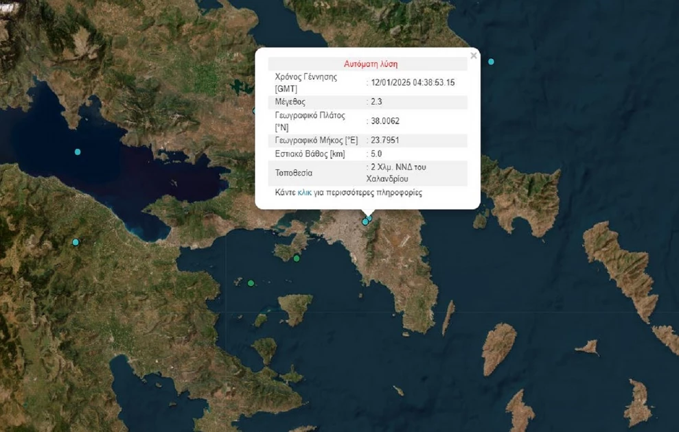 Λίγο μετά τις 06:30 το πρωί της Κυριακής (12/1) σημειώθηκε σεισμική δόνηση μεγέθους 2,3 βαθμών της κλίμακας Ρίχτερ 2 χιλιόμετρα Νοτιοδυτικά του Χαλανδρίου.